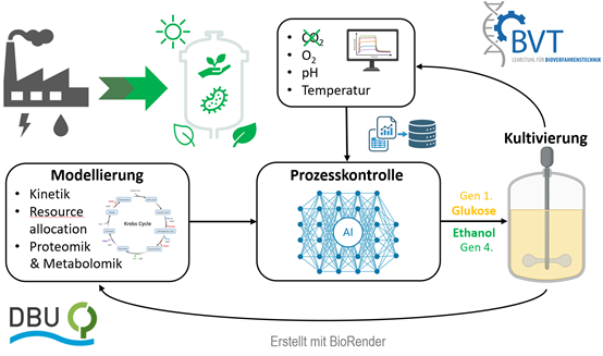 Im Fokus dieses Projekts steht die nachhaltige, CO2-freie Produktion von Feinchemikalien, insbesondere Mevalonat und PHB, durch die kombinierte Nutzung von Glukose und Ethanol. Als Biokatalysator kommen metabolisch optimierte Stämme von Corynebacterium glutamicum zum Einsatz. Für ein tiefgehendes Verständnis der komplexen intrazellulären Vorgänge werden mathematische Modelle entwickelt, die stöchiometrische Netzwerke, Co-Substrat-Kinetiken und experimentelle, mittels UHPLC-Massenspektrometrie erhobene Multi-Omics-Daten integrieren. Darauf aufbauend wird hier ein KI-gestütztes Steuerungssystem etabliert: Durch die Fusion von Modellvorhersagen und realen Prozessdaten sollen die Prozesseffizienz gesteigert und eine intelligente Automatisierung der Kultivierung ermöglicht werden.
